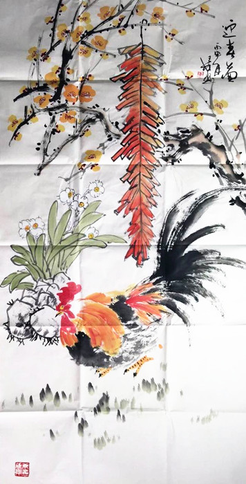 • 产品简介: 玄关挂画大吉大利公鸡图,王柳春韩四尺竖幅佳作,未装裱