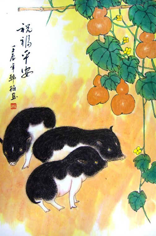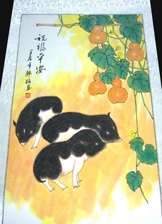第一字画网的国画祝福平安,这幅竖幅的三猪图装裱后长1.6米左右,是一副非常温馨的作品,作品画风细腻、栩栩如生,寓意吉祥,挂在家里卧室、书房或客厅都是非常不错的选择,亦可用作送礼等场合,如果放在画廊出售,韩梅老师此幅国画祝福平安的标价在1000元左右。