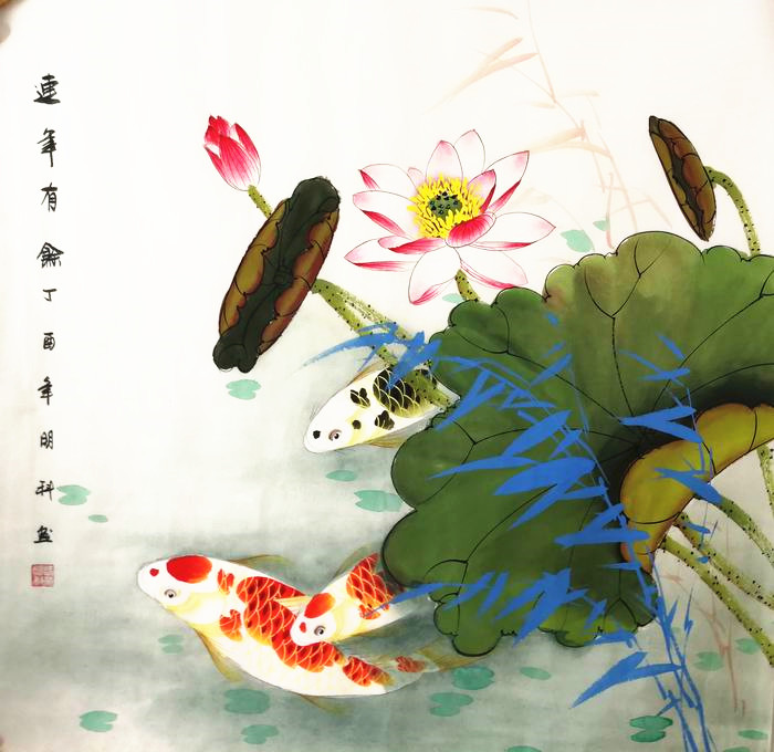 第一字画网的工笔鱼佳作,这幅四尺斗方的作品适合作为进门玄关挂画,玄关挂画选择荷花鲤鱼图效果不错,这幅非常清新的工笔鱼作品,挂在家里或是送人都是非常不错的选择,如果放在画廊出售,广西画家诸葛明科老师此幅四尺斗方国画玄关画的标价在1500元左右。“鱼”与“余”谐音,鱼则象征着富贵,所以中国吉祥图案中常有鱼的图案。