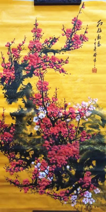第一字画网的竖幅红梅画,这幅四尺的竖幅玄关字画红梅画画风细腻、栩栩如生,是王美琦老师的实力作品,作品题字为红梅报春,喜气十足,梅花不畏严寒,独步早春,这种不屈不挠的精神和顽强意志,历来被人们当作崇高品格和高洁气质的象征。如果放在画廊出售,这幅四尺竖幅红梅字画的标价在2000元左右。