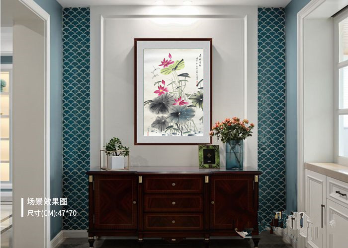 第一字画网的玄关字画荷花画,是幅适合客厅或居室挂的荷花花鸟画。这幅家居花鸟画是副温馨祥和的花鸟作品,装裱后长度达到1.2米左右,作品细腻生动、栩栩如生。如果放在画廊出售,赵墨老师此幅客厅荷花鸟画的标价大约在1000元左右。
