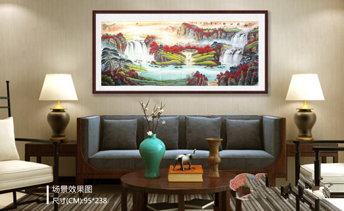 第一字画网的客厅山水挂画山水画聚宝盆,是一副大气磅礴的作品,彩墨交融,墨色清雅,是王咏茗老师的用心作品。小八尺大写意山水裱完后尺寸达到3米左右,如果放在画廊出售,王咏茗此副大写意山水的标价在7000元左右。这幅作品适合挂在家里的客厅、或公司的办公室、会议室等场合,作品布局合理、意境深动。