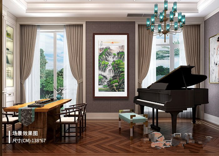 第一字画网的玄关装饰画聚财山水画,这幅四尺的家居装饰字画聚财山水画尺寸近1.8米左右,是一幅大气磅礴的四尺山水作品,作品雄浑苍劲,清新秀雅,布局合理、气势磅礴,这幅山水美景视觉效果上佳。如果放在画廊出售,刘淋老师此幅聚财山水字画的标价在3000元左右。