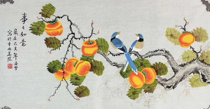 • 产品简介: 国画柿子图《事事如意》,凌雪三尺工笔画佳作