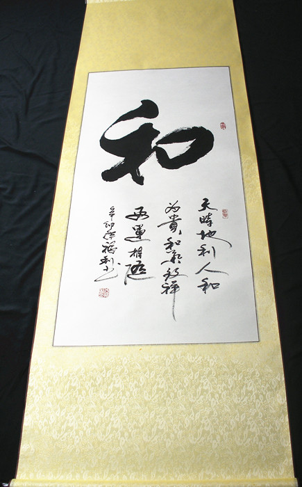 第一字画网的书法作品《和》,这幅书法是山东书法家协会福利老师的书法作品,装裱成轴后长度约在1.5米左右,可以直接悬挂,作品笔法老练,小字为:天时地利人和为贵,和气致祥好运相连。如果放在画廊出售,福利老师此副书法作品和字裱完后的标价大约在1000元左右。