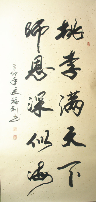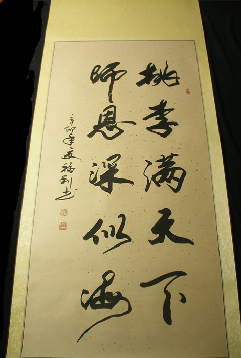 第一字画网的送老师书法作品桃李满天,这幅书法是山东书法家协会福利老师的书法作品,装裱成轴后长度约在1.8米左右,可以直接悬挂,作品笔法老练,对联书法桃李满天下,师恩深似海。如果放在画廊出售,福利老师此副书法作品对联裱完后的标价大约在1200元左右。