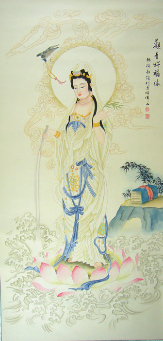 • 产品简介: 名家人物画观音像中堂画,山东画家韩梅老师作品。