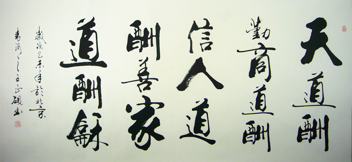 第一字画网的天道酬勤商道酬信人道酬善家道酬和,适合挂在公司的办公室,或是家里的客厅,这幅六尺书法办公室书法天道人道商道是广西书法家甘正砚老师的作品,用的是大六尺宣纸,装裱后长度约在2.2米左右,作品笔法老练苍劲大气,如果放在画廊出售,甘正砚老师这幅六尺天道人道商道家道书法的价格大约在2500元左右。