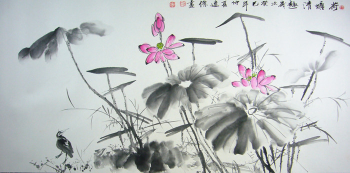 • 产品简介: 四尺国画荷塘清趣,老画家覃连杰四尺水墨画荷花佳作,已装裱。