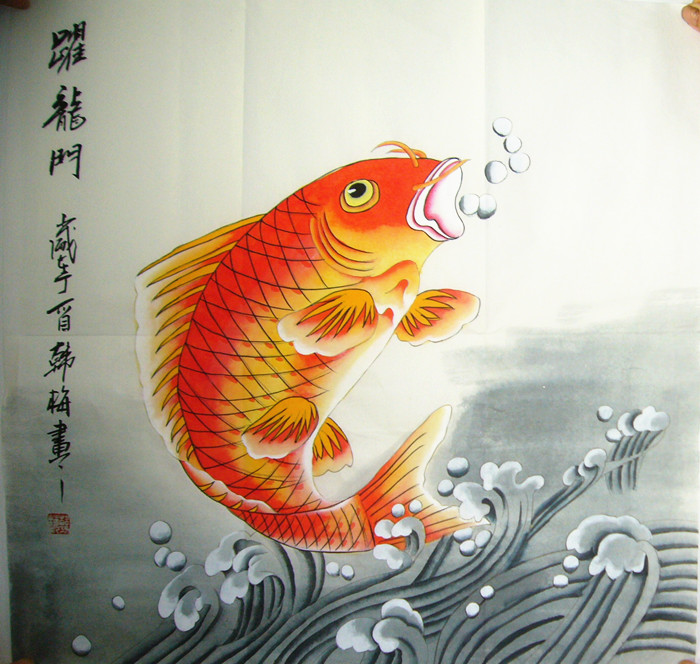 • 产品简介: 花鸟画鲤鱼图跃龙门,齐鲁名家韩梅老师。