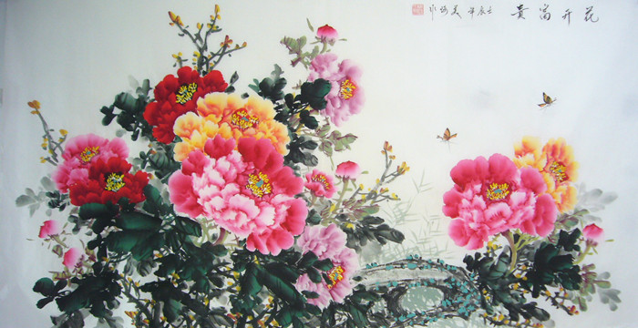 第一字画网的六尺富贵牡丹图,六尺牡丹作品裱完后尺寸近2.2米,牡丹寓意着富贵吉祥,作品上又写着花开富贵四个字,是一幅性价比不错的六尺作品,如果放在画廊出售,美琦老师此副六尺富贵牡丹图裱完后的标价在1600元左右。