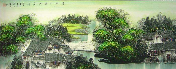 第一字画网的水乡春日风景画,六尺小桥流水人家风景画裱完后长度近2.2米左右,是一幅意境深动的水乡春景作品,作品意境空灵,色彩典雅而不失墨韵,布局合理,视觉效果上佳,是刘智东老师针对江南水乡的一幅清新作品。如果放在画廊出售,刘智东老师此幅水乡风景画的标价在7000元左右。