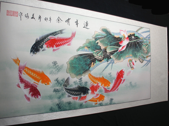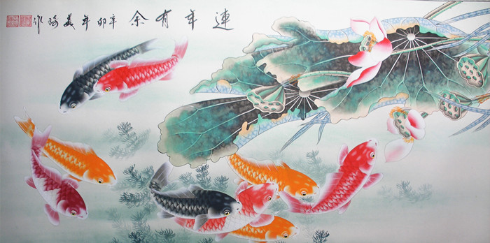 第一字画网的九鱼图连年有余,这幅四尺的九鱼作品裱完后尺寸近1.8米左右,是一幅非常清新的作品,作品画风细腻、栩栩如生,九鱼图寓意着长长久久,吉祥如意,挂在家里客厅或是送人都是非常不错的选择,如果放在画廊出售,王美琦老师此幅九鱼图作品的标价在1500元左右。“鱼”与“余”谐音,鱼则象征着富贵,所以中国吉祥图案中常有鱼的图案。九鱼图中,“九”取长长久久之意,“鱼”取其万事如意,寓意年年有余,富贵有余。