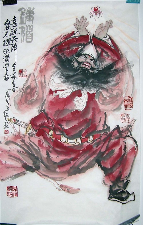 赏玩相起久的人物画卷,深感他的人物画作涉猎面宽广,齐鲁贤士、豪杰及我国历史名人跃然纸上。人文始祖的轩辕黄帝,决胜千里的诸葛孔明、孙武,精忠报国的名将岳飞,悠哉悠哉的姜氏太公,儒雅学者孔子、孟子,直至喜笑颜开的大肚弥勒,清秀怡雅的观音大士,励精图治的齐恒公,到文人李清照、蒲松龄等,无不在他的画笔下栩栩如生。相起久把人生的洒脱融入画中,画英雄,倾泻一份正直,气壮山河的侠骨豪气;画美女,尽现一份玉面红颜,眉目传情,娇柔可爱;画学者,展现出长者风范,一派儒雅;画巾帼,描绘出英姿飒爽,不饰雕琢,画面自然、流畅。他的巨幅图画《杏坛设教图》,创作时打破常规,一棵繁花盛开的杏树下,广额智目的孔子抚琴弹奏。围拢于四周的弟子有老有少,目光凝聚于琴面,聆听入神入境,面部表情各异,刻画细致入微。作品立意独特,独辟新径,运用浓与淡、虚与实对比,疏密得体,色彩明快,洋溢着一种乐观与奔放。尽现古代教育家的风采。